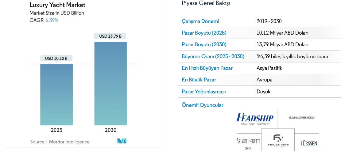 Mordor Intellegent araştırma şirketinin raporuna göre; lüks yat pazarının 2025 yılında 10,12 milyar ABD doları değerinde olması ve 2030 yılına kadar %6,39'luk bir bileşik yıllık büyüme oranıyla 13,79 milyar ABD dolarına ulaşması bekleniyor.