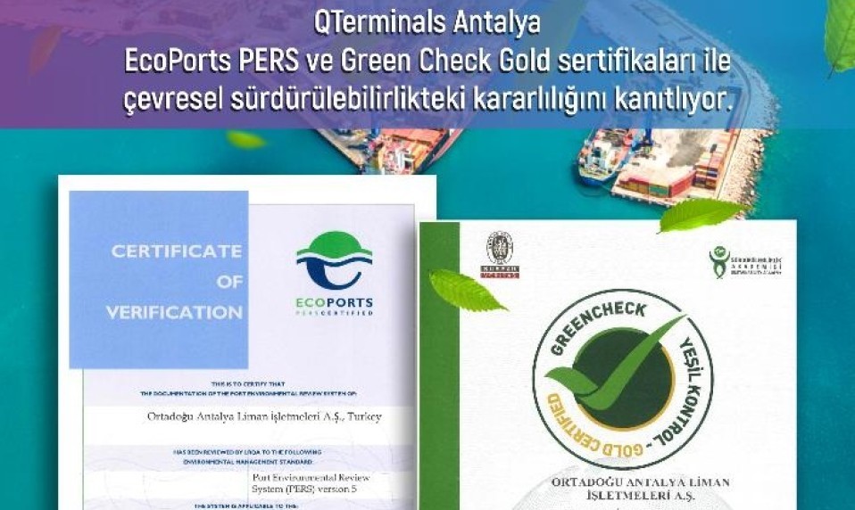 QTerminals Antalya, uluslararası denetimlerde sergilediği üstün performansla iki önemli çevre sertifikasına birden layık görüldü. Şirket, EcoPorts PERS Sertifikası’nı üçüncü kez, Green Check Gold Sertifikası’nı ise ikinci kez almaya hak kazandı. QTerminals Antalya Limanı çevresel sürdürülebilirlik alanındaki kararlılığını ve liderliğini aldığı sertifikalarla bir kez daha kanıtladı.